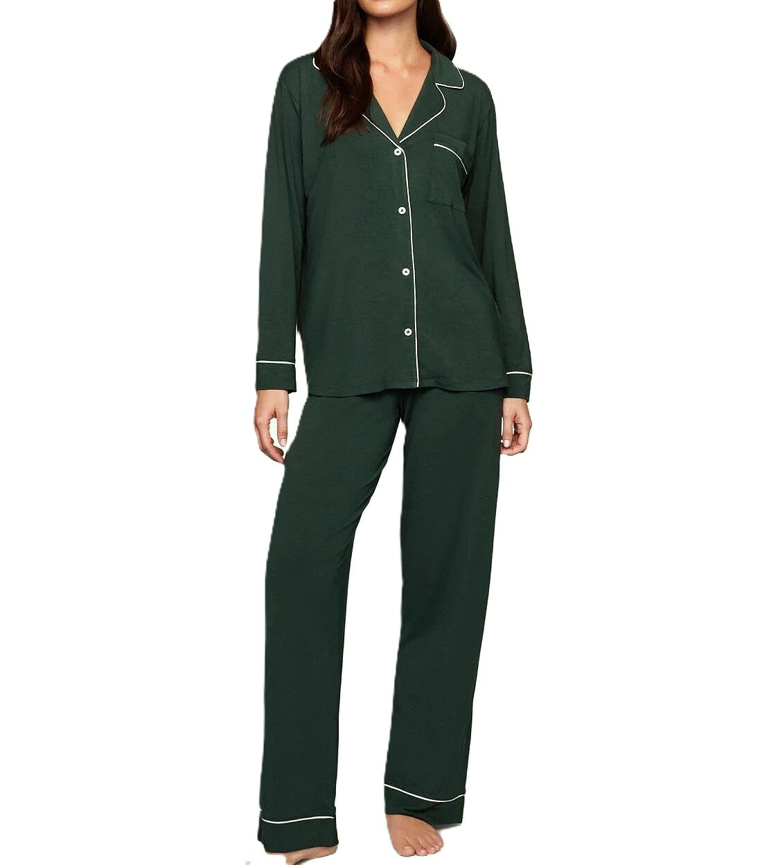 The Eberjey 2 piece button down PJ Set is so soft and comfy against your body. Top features front button-down closure with contrast piping. Matching pants with elastic waist also trimmed in contrast piping. 89% modal 11% Spandex.